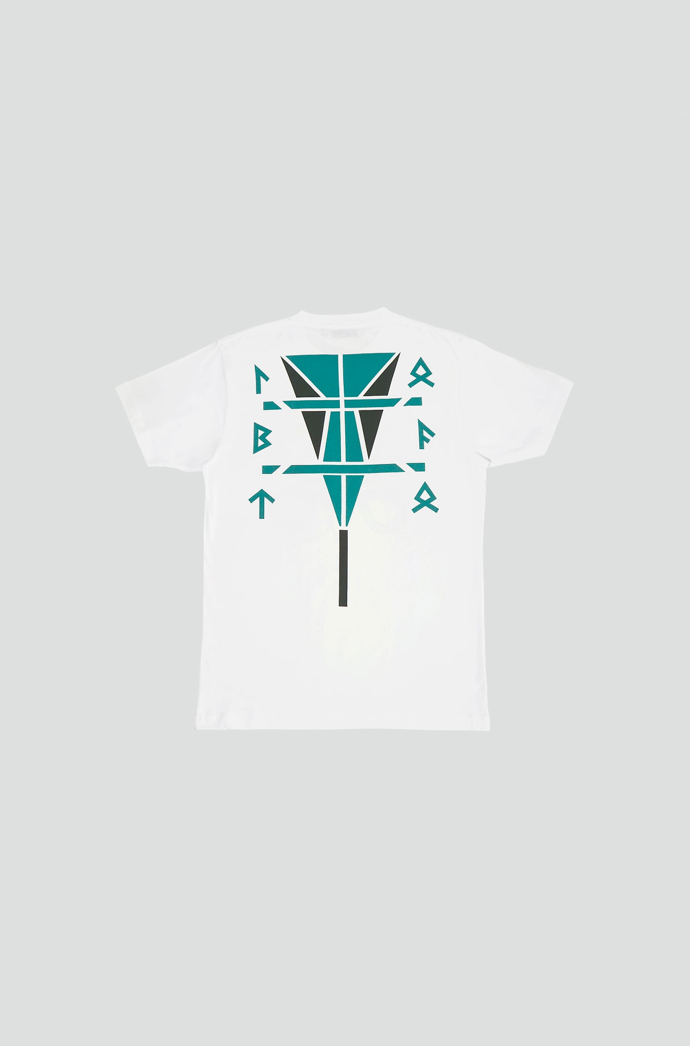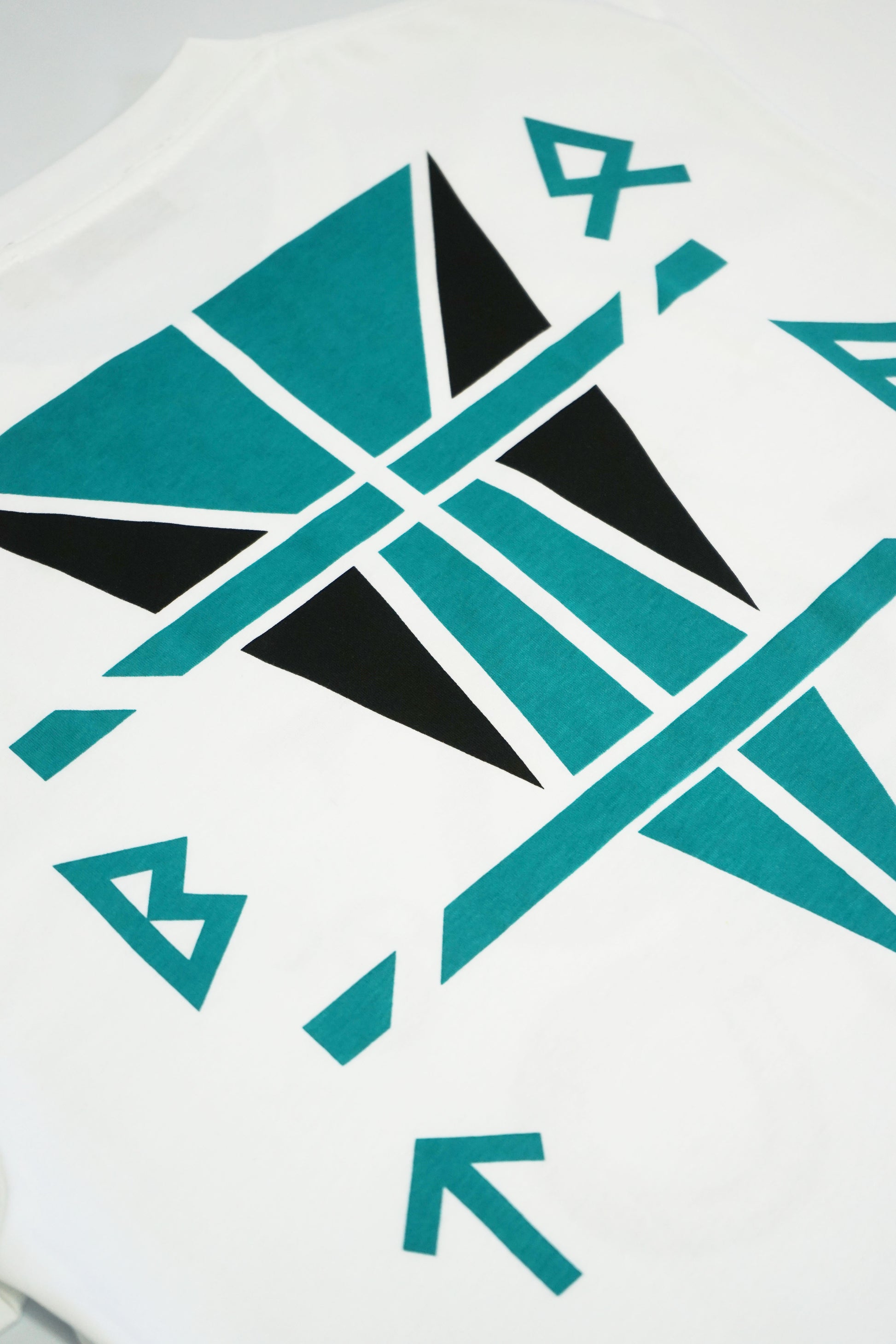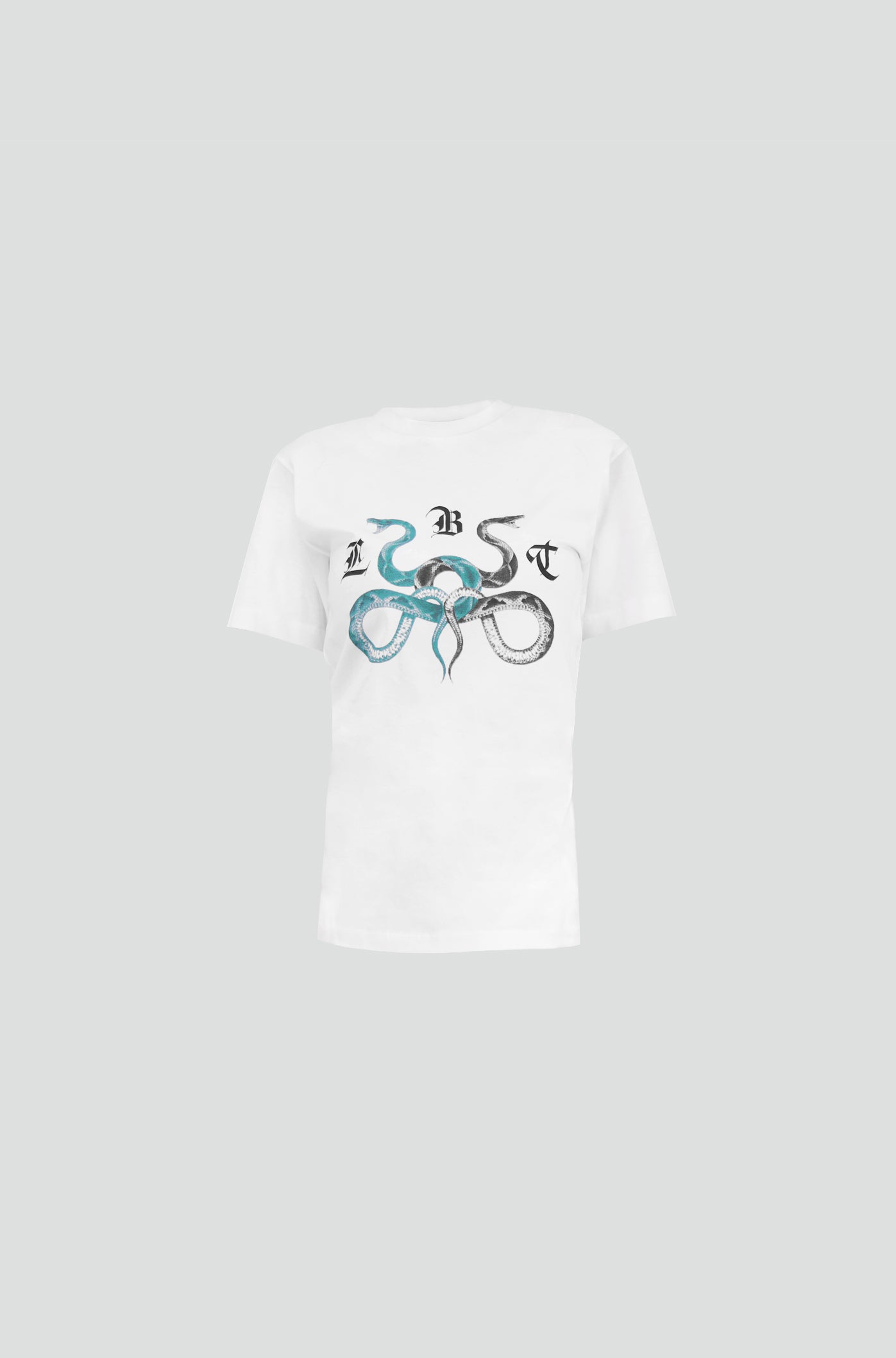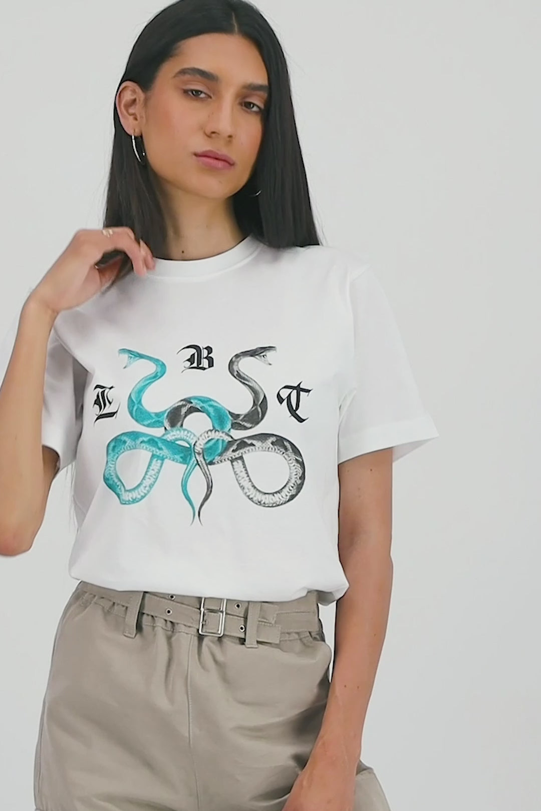 This short-sleeved white jersey T-shirt is made of 100% cotton. It stands out with its unique prints: on the front, snake motifs combined with the brand’s initials add a bold and rebellious touch. On the back, a stylized side message, highlighted by the brand’s distinctive symbol, reinforces the visual identity with refined turquoise accents. This piece combines quality and meticulous design, perfect for asserting a style that is both modern and sophisticated.
