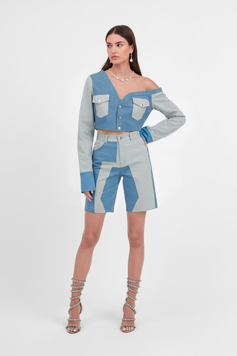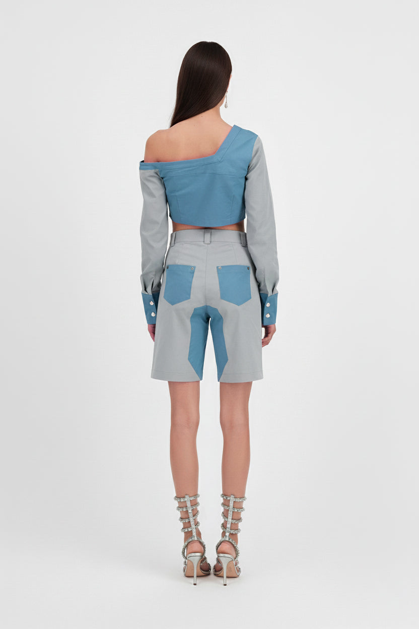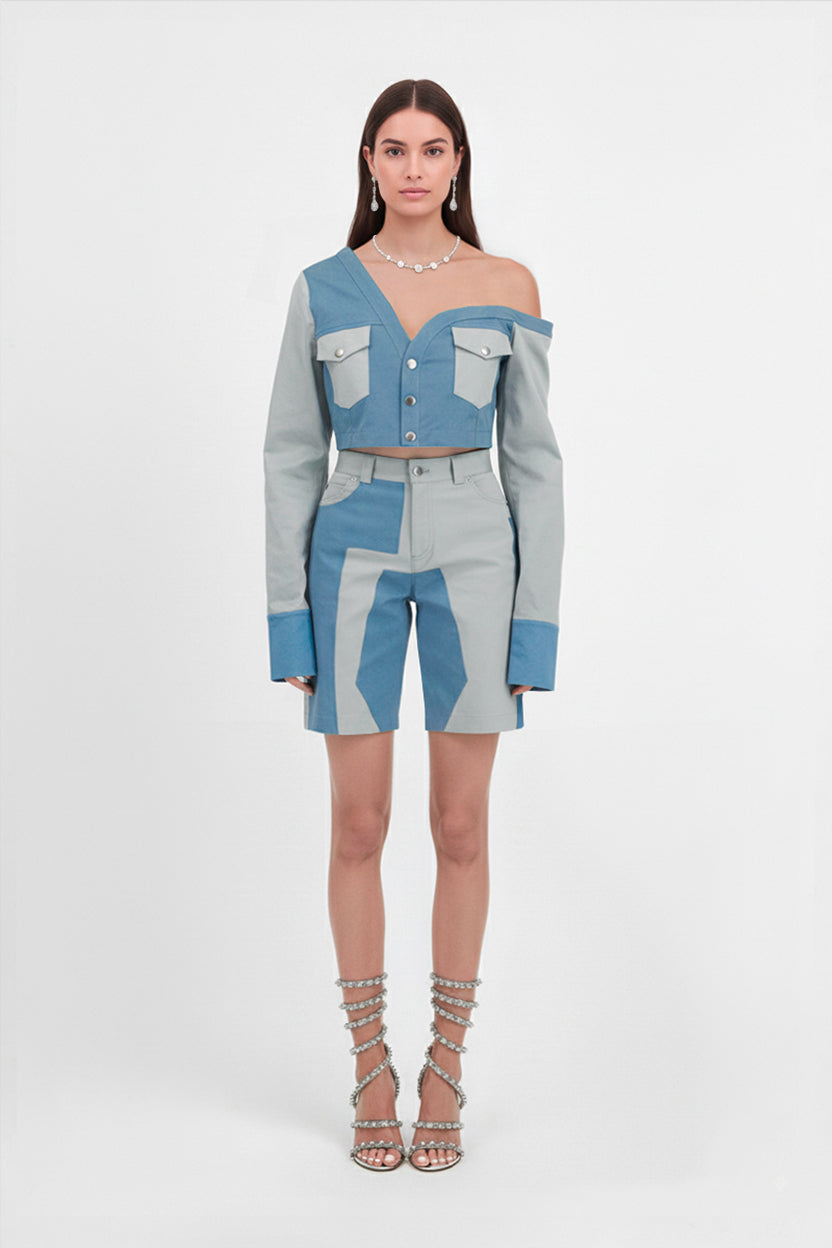 The TVB top stands out with its bold yet refined design, combining an elegant two-tone aesthetic with a cropped cut that reimagines the silhouette of a classic shirt. Its asymmetrical structure highlights a bare shoulder, adding a subtle touch of modernity and originality. Made from 100% cotton and designed to balance functionality with style, this top features a practical front opening, well-integrated pockets, and sleeves enhanced with snap buttons for easy adjustment.