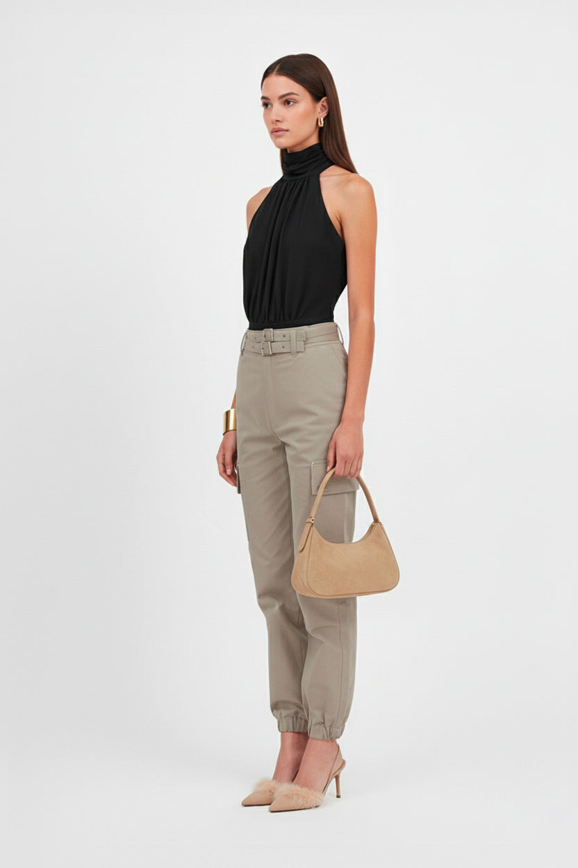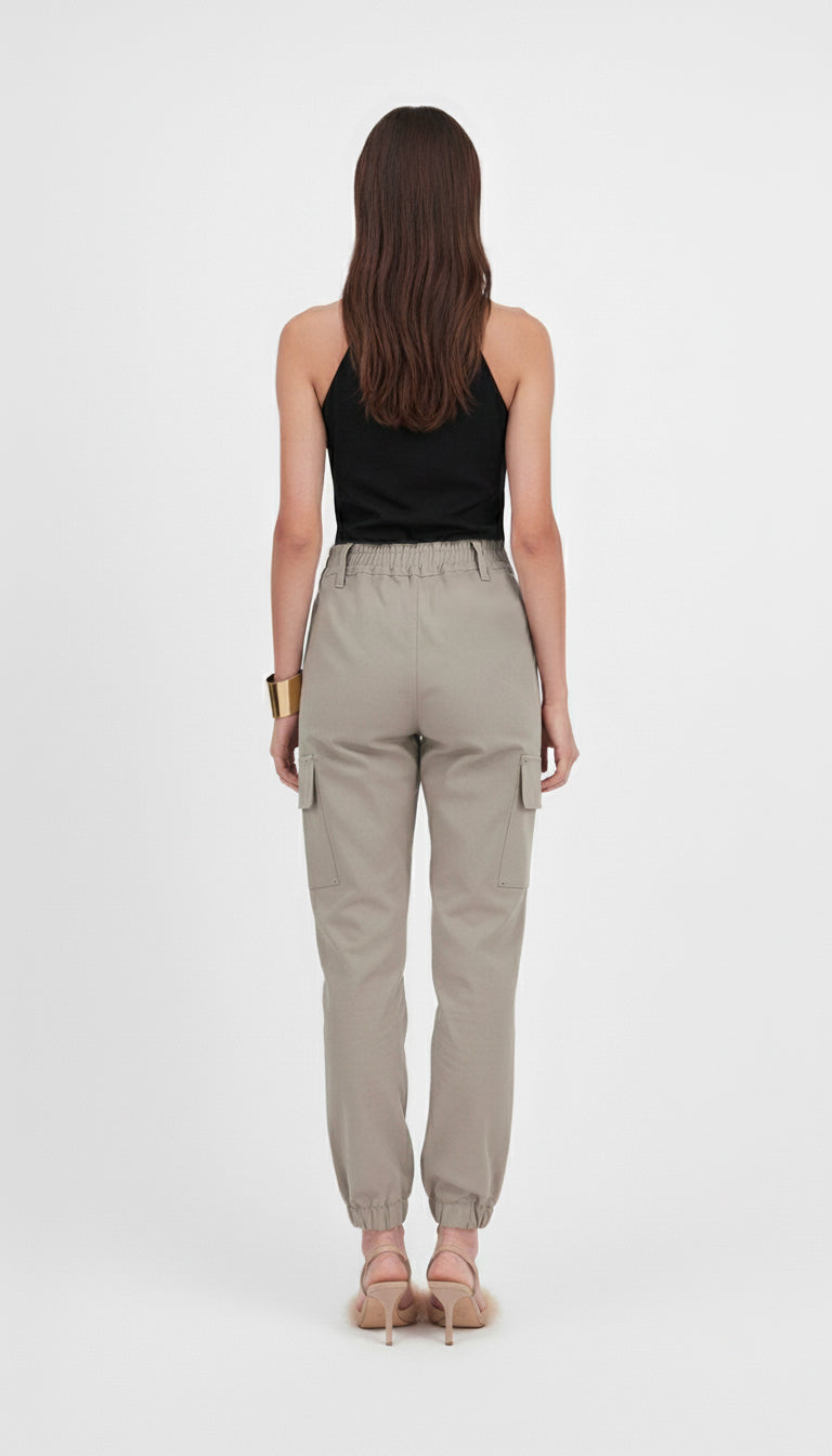 Calças cargo de cintura subida com cós elástico, confecionadas em canvas 100% algodão para um conforto e uma durabilidade ótimos. Equipadas com duas pequenas cintas para um ajuste perfeito e com bolsos laterais aplicados e práticos, estas calças aliam funcionalidade a um estilo contemporâneo. O seu corte estruturado valoriza a silhueta, ao mesmo tempo que oferece grande liberdade de movimento. Uma escolha ideal para um look urbano simultaneamente sofisticado e descontraído.